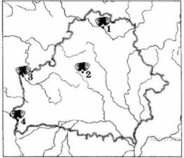 Город, в котором во время немецко-фашистской оккупации Беларуси развернула деятельность подпольная группа под руководством К. Заслонова, обозначен на картосхеме цифрой: